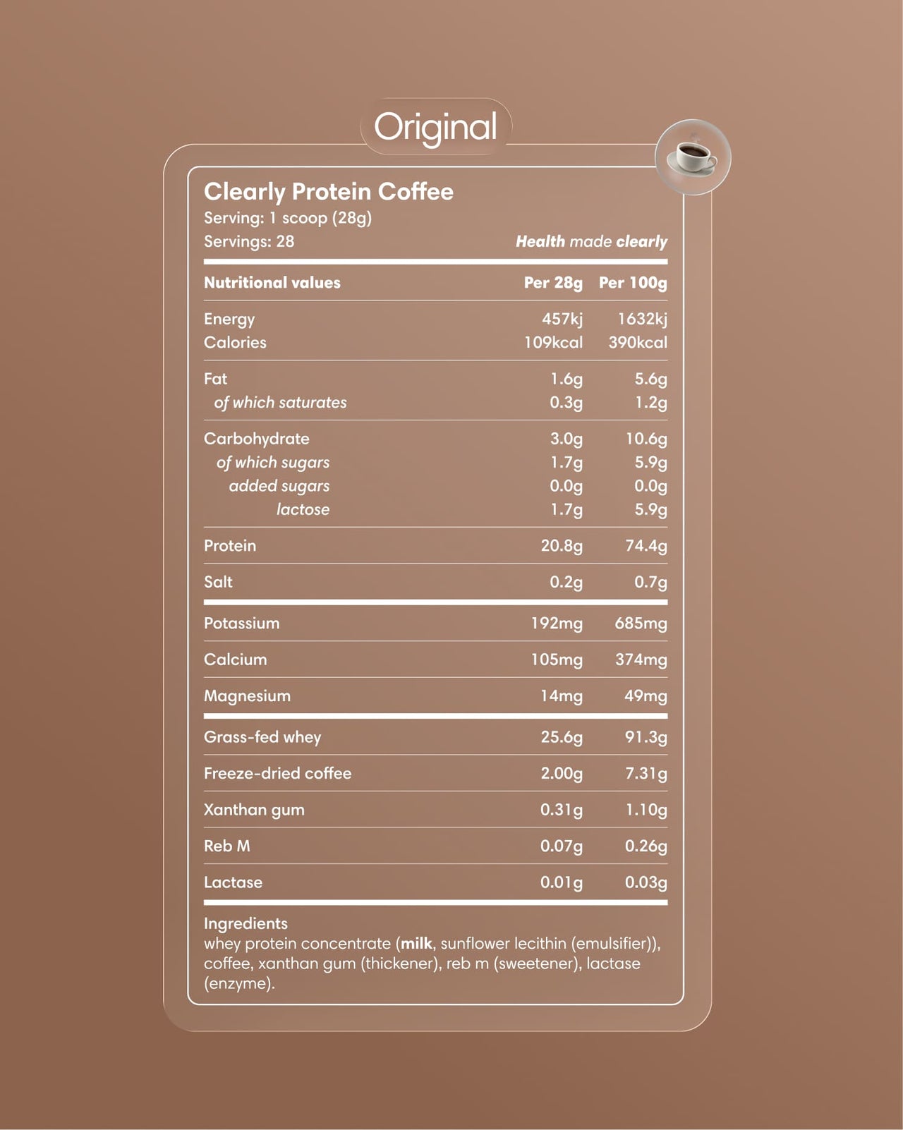 Our Protein Iced Coffee combines 100% Colombian arabica coffee with grass-fed whey from New Zealand. The coffee is freeze-dried to optimally preserve its flavor, and the whey comes from cows that graze outdoors at least 350 days per year. A clean alternative with 21 g of protein and 35–45 mg of caffeine.